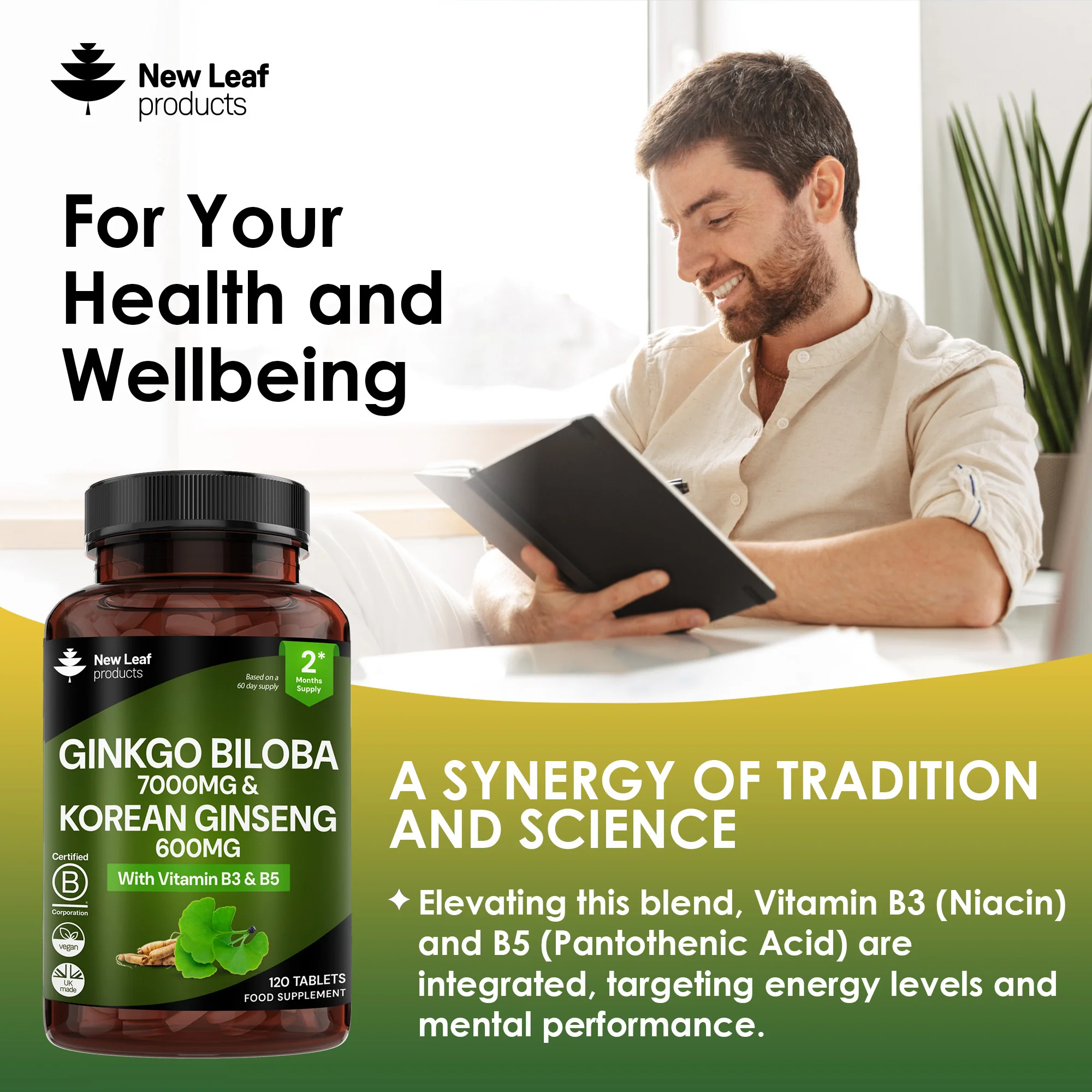 New Leaf's presents a unique blend in its Ginkgo Biloba and Korean Ginseng Tablets, designed for holistic wellness. This potent formula, offering a two-month supply with 120 tablets, combines 7000mg of Ginkgo Biloba and 600mg of Panax Ginseng. Ginkgo Biloba, known for its Terpene Lactones and Flavone Glycosides, and Panax Ginseng, a revered adaptogen, are unified to support cognitive and physical vitality.