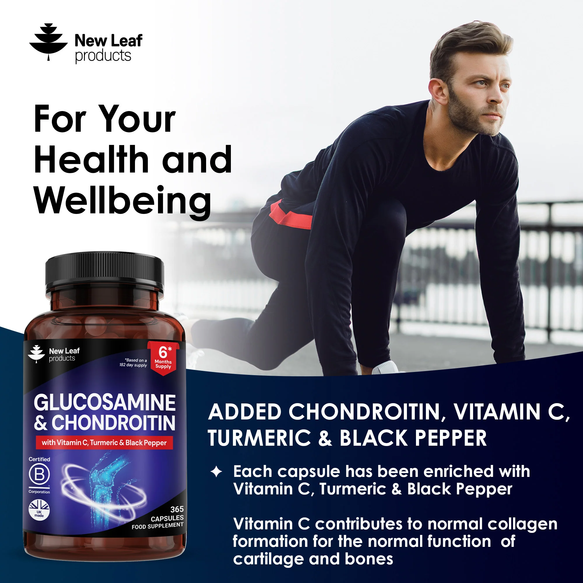 GLUCOSAMINE AND CHONDROITIN HIGH STRENGTH - Each serving of New Leaf supplement contains 1100mg of Glucosamine Sulfate, 100mg of Chondroitin Sulphate, 100mg of Turmeric 10mg of Black Pepper and 80mg of Vitamin C. Each bottle is good for 2 months with the recommended 2 capsules daily.