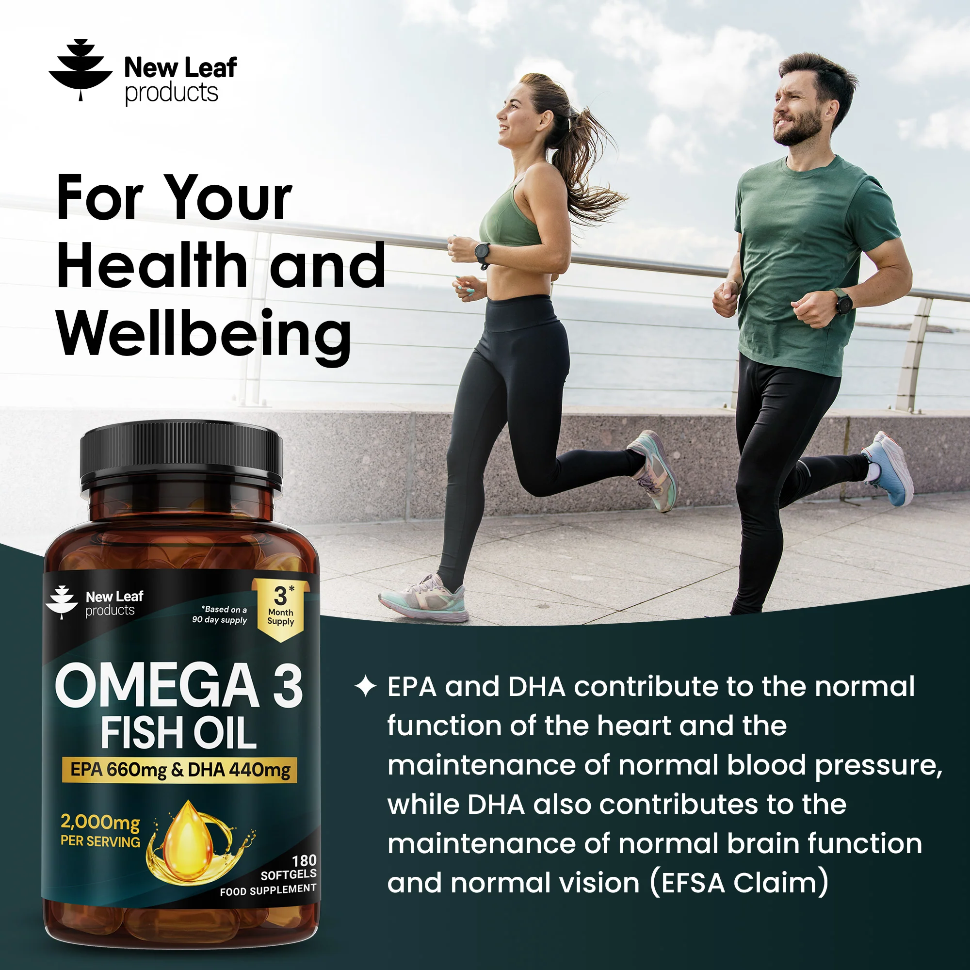 New Leaf's Omega-3 Fish Oil Softgels provide 2000mg of Omega-3 fatty acids per serving, with a higher concentration of essential EPA and DHA. Each serving delivers 660mg of EPA and 440mg of DHA, sourced from high-quality fish oil. With 180 softgels per bottle, you receive a convenient three-month supply, making it easy to incorporate these vital nutrients into your daily routine for overall wellness.